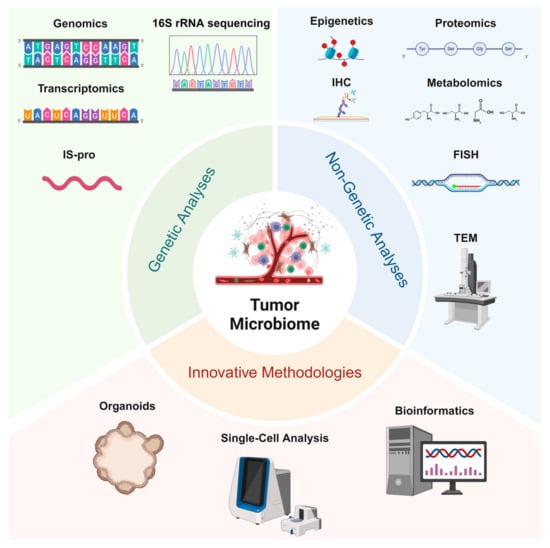 Studying tumor microbiomes involves genetic analyses (genomics, 16S rRNA sequencing, transcriptomics, and IS-pro profiling) for microbial identification and functional insights, non-genetic analyses (proteomics, metabolomics, IHC, FISH, and TEM) to examine microbial–tumor interactions, and innovative methodologies (organoids, single-cell analysis, and bioinformatics) that enable the advanced exploration of tumor–microbe dynamics and support translational research.