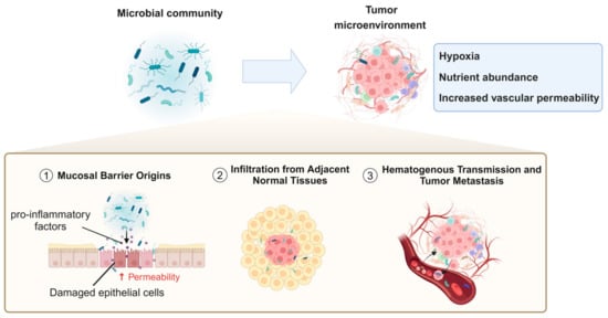 The origins of the tumor microbiome are influenced by multiple factors. Current research emphasizes the complexity of microbe–tumor interactions, making it crucial to understand the sources of microorganisms within tumors. This understanding is vital for elucidating the causal relationships between microbial infiltration and colonization in the process of tumorigenesis. The microbes detected within tumor tissues may not be merely random “passengers”, but rather integral components closely associated with tumor physiology, local immune status, and metabolic activities. Identifying the sources of these microbes aids in preliminarily determining their roles in tumor formation and progression. Furthermore, distinguishing the origins of microbes is essential for differentiating between “opportunistic invaders” and “endogenous partners”. If certain microbes originate from adjacent normal tissues or mucosal microbiota, this may indicate a disruption in the succession and balance between normal and abnormal states. Under specific conditions, these microbes may thrive and overproliferate, with their metabolic products, virulence factors, and interactions with the immune system potentially promoting tumor cell growth and metastasis. Conversely, if some microbes originate from external environments (such as the oral cavity, skin, or through external infections), it suggests that researchers should focus on the association between environmental factors and tumorigenesis, thereby guiding clinical prevention and intervention strategies. By thoroughly understanding how microbes enter and colonize tumor tissues, we can reevaluate the comprehensive landscape of tumor development. This insight not only facilitates a more precise understanding of the complex network structure of the tumor microenvironment but also provides a reliable theoretical foundation and potential intervention targets for future precision diagnostics and therapeutics.