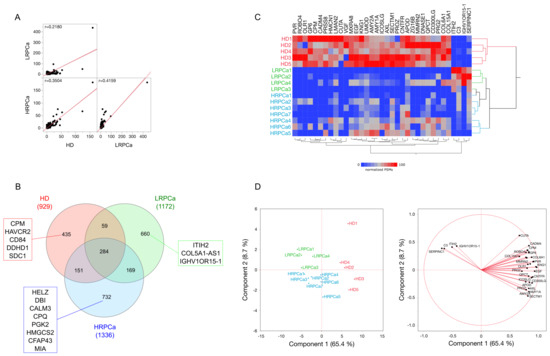 Proteomic analysis was performed on urine samples from HD and PCa patients categorized as low- (LRPCa) and high-risk (HRPCa). (A) Spearman’s correlation was used to compare the global protein profiles of HD, LRPCa, and HRPCa groups. (B) A Venn diagram shows proteins uniquely identified in HD, LRPCa, and HRPCa groups. Red, green, and blue rectangles show proteins found in at least 40% of subjects per group. (C) Hierarchical clustering and (D) Principal Component Analysis (PCA) were conducted using peptide spectrum matches (PSMs) of differentially abundant proteins (DAPs) extracted via Linear Discriminant Analysis (LDA); both show a good grouping based on the health status of the subjects considered. Principal Component1 (PC1) and Principal Component2 (PC2) accounted for 65.4% and 8.7% of the variance, respectively. Hierarchical clustering employed Euclidean distance metrics and Ward’s method.