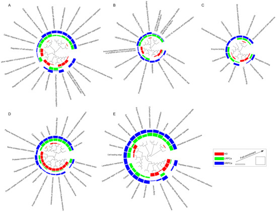 Functional enrichment analysis. (A) GO biological process, (B) pathways, (C) GO molecular function, (D) COMPARTMENT, (E) and GO cellular component differentially enriched by comparing HD (red), LRPCa (green) and HRPCa (blue) groups. The functional modules were enriched starting from the whole protein profile characterized per subject (FDR ≤ 0.05), while the enrichment profiles were compared by linear discriminant analysis (LDA, p ≤ 0.05).