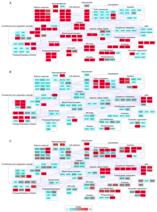 Protein–protein interaction (PPI) network and functional modules differentially abundant in (A) HD, (B) LRPCa and (C) HRPCa. The PPI network was reconstructed starting from proteins selected as differentially abundant (DAPs, n = 141); only database (score ≥ 0.3) and experiment (score ≥ 0.15) annotated interactions were considered. The functional modules were defined through STRING and BINGO Cytoscape’s APPs (p ≤ 0.05). The color code, from blue to red, is based on the normalized PSM values (range 0–100) and indicates low (blue) and high (red) abundant proteins.