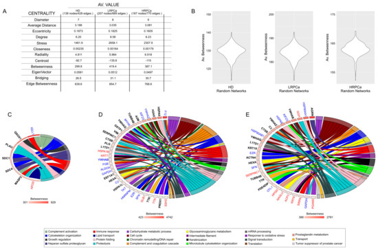 Network topology. (A) Media netw (A) Average network centralities calculated for the HD, LRPCa and HRPCa PPI network models. (B) Violin plots of betweenness from HD, LRPCa and HRPCa PPI random network models; the average value of betweenness in real models (A) differs from that of random networks validating the selection of hubs/bottlenecks. (C) Hubs and bottlenecks from HD, (D) LRPCa and (E) HRPCa; specifically, blue gene names indicate hubs selected by betweenness and centroid, red gene names indicate bottlenecks selected by betweenness and bridging, while black bold gene names indicate hubs/bottlenecks selected by betweenness, centroid and bridging centralities. Hubs and bottlenecks were related to their main functions, and the GO chord plots show that in PCa patients, they mainly fall in cell cycle, complement and coagulation cascade, immune response and proteolysis.