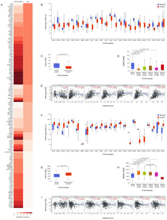 Figure 5B,F illustrate the TCGA expression data for CPM and KRT8, respectively, across a pan-cancer dataset, comparing expression levels in tumor tissues versus their normal counterparts. This analysis highlights distinct expression patterns for CPM and KRT8, suggesting their potential roles as biomarkers across various cancers. In PCa patients specifically, expression differences for both proteins were statistically significant (p = 3.13 for CPM and p = 1.03 for KRT8, shown in Figure 5C and Figure 5G, respectively). Further analysis of CPM expression in normal versus PCa tissues revealed statistically significant differences across several GS, including GS 6 (p = 4.66 ), GS 7 (p = 4.61 ), and GS 9 (p = 4.94 ) (Figure 5D). When examining CPM expression by nodal status, a significant difference was found between normal tissues and N0 status (p = 4.49 ), though no significant differences were observed between normal and N1 or N0 and N1. Additionally, TIMER analysis indicated that CPM expression is correlated with immune cell infiltration, specifically with B cells, CD4+ T cells, CD8+ T cells, macrophages, neutrophils, and dendritic cells (Figure 5E), suggesting a potential role for CPM in the tumor microenvironment and immune response. Also KRT8 expression in normal versus PCa tissues revealed statistically significant differences across GS, including normal prostate tissue versus GS 6 (p = 1.80 ), GS 7 (p = 3.44 ), GS 8 (p = 2.01 ), GS 9 (p = 9.43 ) and GS 7 versus GS 9 (p = 2.66 ) (Figure 5H). When examining KRT8 expression by nodal status, a significant difference was found between normal tissues and N0 status (p = 9.41 ) and normal versus N1 status (p = 9.95 ). Finally, like CPM, KRT8 expression correlated with immune cell infiltration, specifically with B cells, CD4+ T cells, CD8+ T cells, macrophages, neutrophils, and dendritic cells (Figure 5I).
