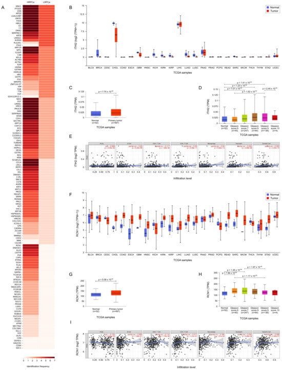 TCGA bioinformatic analysis. (A) Heatmap illustrating the frequency of protein expression in urine samples from prostate cancer-affected patients classified LRPCa and HRPCa. (B) TCGA expression data for Inter-alpha-trypsin inhibitor heavy chain H2 (ITIH2) across a pan-cancer dataset, comparing expression levels in tumor tissues (red) versus their normal counterparts (blue). (C) ITIH2 expression in normal vs. primary tumor. (D) ITIH2 expression in normal versus PCa tissues with different Gleason scores (GS). (E) TIMER analysis correlating ITIH2 expression with immune cell infiltration. (F) TCGA expression data for Reticulocalbin-1 (RCN1) across a pan-cancer dataset, comparing expression levels in tumor tissues (red) versus their normal counterparts (blue); Wilcoxon test p ≤ 0.05. (G) RCN1 expression in normal vs. primary tumor. (H) RCN1 expression in normal versus PCa tissues with different Gleason score (GS); Wilcoxon test p ≤ 0.05. (I) TIMER analysis correlating RCN1 expression with immune cell infiltration.