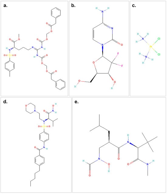 The structures of the therapeutic agents and ligands used in the molecular docking study are shown. (a) represents the 2D structure of proTAME. (b) illustrates gemcitabine, while (c) shows cisplatin. (d) presents the small-molecule ligand I52, and (e) depicts the 2D structure of the small-molecule ligand NFH. The chemical structures used in this figure were downloaded and modified from the PubChem database, https://pubchem.ncbi.nlm.nih.gov (accessed on 9 October 2024).