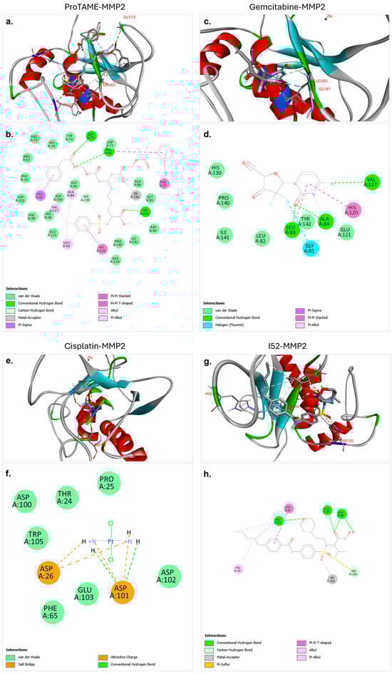 Molecular docking interactions of proTAME, gemcitabine, cisplatin, and I52 with MMP2. (a,b) ProTAME–MMP2: 3D visualization (a) demonstrates stable positioning of proTAME within the active site of MMP2, supported by interactions with key residues, as detailed in the 2D interaction map (b). (c,d) Gemcitabine–MMP2: 3D visualization (c) shows gemcitabine effectively bound to active site of MMP2, with the 2D interaction map (d) outlining residue-specific interactions. (e,f) Cisplatin–MMP2: 3D visualization (e) illustrates the positioning of cisplatin within the active site of MMP2, with the 2D interaction map (f) displaying key stabilizing interactions. (g,h) I52–MMP2: 3D visualization (g) highlights strong binding of I52 to the active site of MMP2, with the 2D interaction map (h) summarizing its stabilizing interactions. This figure highlights the varying binding affinities and interaction networks of these ligands within the active site of MMP2.