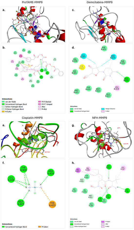 Molecular docking interactions of proTAME, gemcitabine, cisplatin, and NFH with MMP9. (a,b) ProTAME–MMP9: 3D visualization (a) demonstrates the stable binding of proTAME within the active site of MMP9, supported by interactions with surrounding residues. The 2D interaction map (b) highlights key stabilizing interactions, including hydrogen bonds and other forces. (c,d) Gemcitabine–MMP9: 3D visualization (c) shows the effective positioning of gemcitabine within the active site of MMP9, with the 2D interaction map (d) displaying residue-specific interactions contributing to binding. (e,f) Cisplatin–MMP9: 3D visualization (e) illustrates binding of cisplatin to the active site of MMP9, stabilized by multiple interactions as shown in the 2D interaction map (f). (g,h) NFH–MMP9: 3D visualization (g) highlights the positioning of NFH and interactions within the active site of MMP9, with the 2D interaction map (h) summarizing key hydrogen bonds and stabilizing forces. This figure emphasizes the varying binding affinities and interaction networks of these ligands with MMP9.