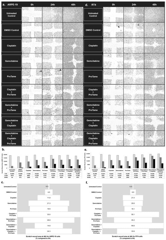 Inhibition of cell migration in ARPE-19 and RT4 cells by cisplatin, gemcitabine, and proTAME treatments in scratch-wound healing assay. (a,d) The images of scratch-wound healing assays performed on ARPE-19 (a) and RT4 (d) cells at 0, 24, and 48 h post-treatment. The cells were treated with DMSO control, cisplatin, gemcitabine, proTAME, or combinations of cisplatin+proTAME, gemcitabine+proTAME, gemcitabine+cisplatin, and gemcitabine+cisplatin+proTAME. Images represent one of three independent replicates (n = 3), with three technical replicates per condition. Images were captured using an inverted microscope at 4× magnification. (b,e) Quantification of the scratch-wound area (µm2) over time for ARPE-19 (b) and RT4 (e) cells, with measurements taken at 0, 24, and 48 h. The data show the reduction in scratch area across different treatment groups, indicating varying degrees of cell migration inhibition. (c,f) The percentage of the scratch-wound area remaining at 48 h relative to the initial wound size (0 h) for ARPE-19 (c) and RT4 (f) cells.