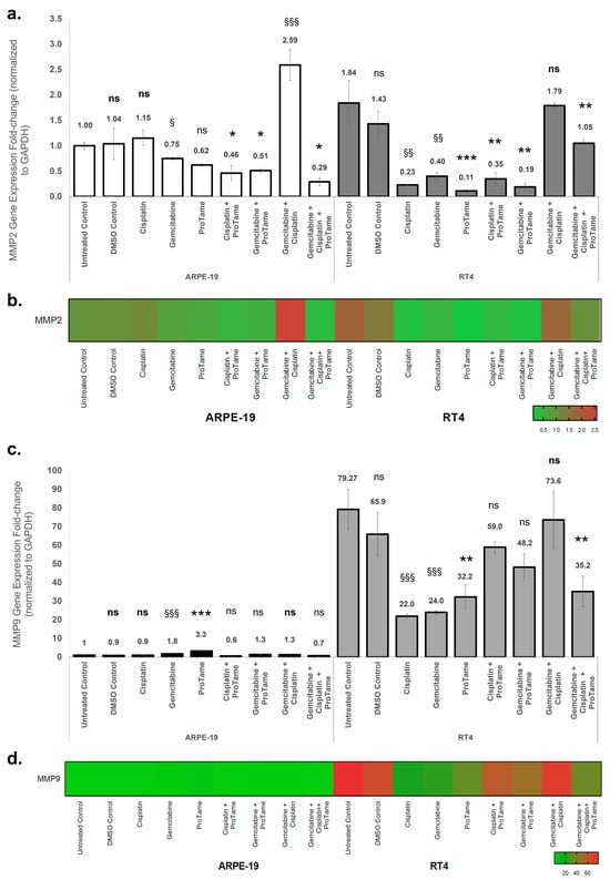 Effects of cisplatin, gemcitabine, and proTAME on MMP2 and MMP9 gene expression in ARPE-19 and RT4 cells. (a) MMP2 gene expression fold change in ARPE-19 and RT4 cells following treatment with cisplatin, gemcitabine, proTAME, and their combinations. (b) MMP2 gene expression heat map visualization. (c) MMP9 gene expression fold change in ARPE-19 and RT4 cells under the same treatment conditions as (a). (d) MMP9 gene expression heat map visualization. Gene expression levels were normalized to GAPDH, and fold changes were calculated using the 2−ΔΔCt method. The data are presented as fold change relative to the ARPE-19 untreated control, with statistical comparisons conducted against the untreated control for cisplatin-, gemcitabine-, and cisplatin+gemcitabine-treated groups. Statistical significance is indicated as follows: ns: non-significant, *: p < 0.05, **: p < 0.01, ***: p < 0.001. Statistical analyses were performed for proTAME, cisplatin+proTAME, gemcitabine+proTAME, and gemcitabine+cisplatin+proTAME groups compared to DMSO control. The statistical significance is indicated as follows: ns (bold): non-significant, §: p < 0.05, §§: p < 0.01, §§§: p < 0.001. The statistical significance of RT4 untreated control was compared to ARPE-19 untreated control. All experiments were performed with three independent biological replicates, each consisting of three technical replicates, and data are presented as mean ± standard deviation (SD) from three independent experiments.