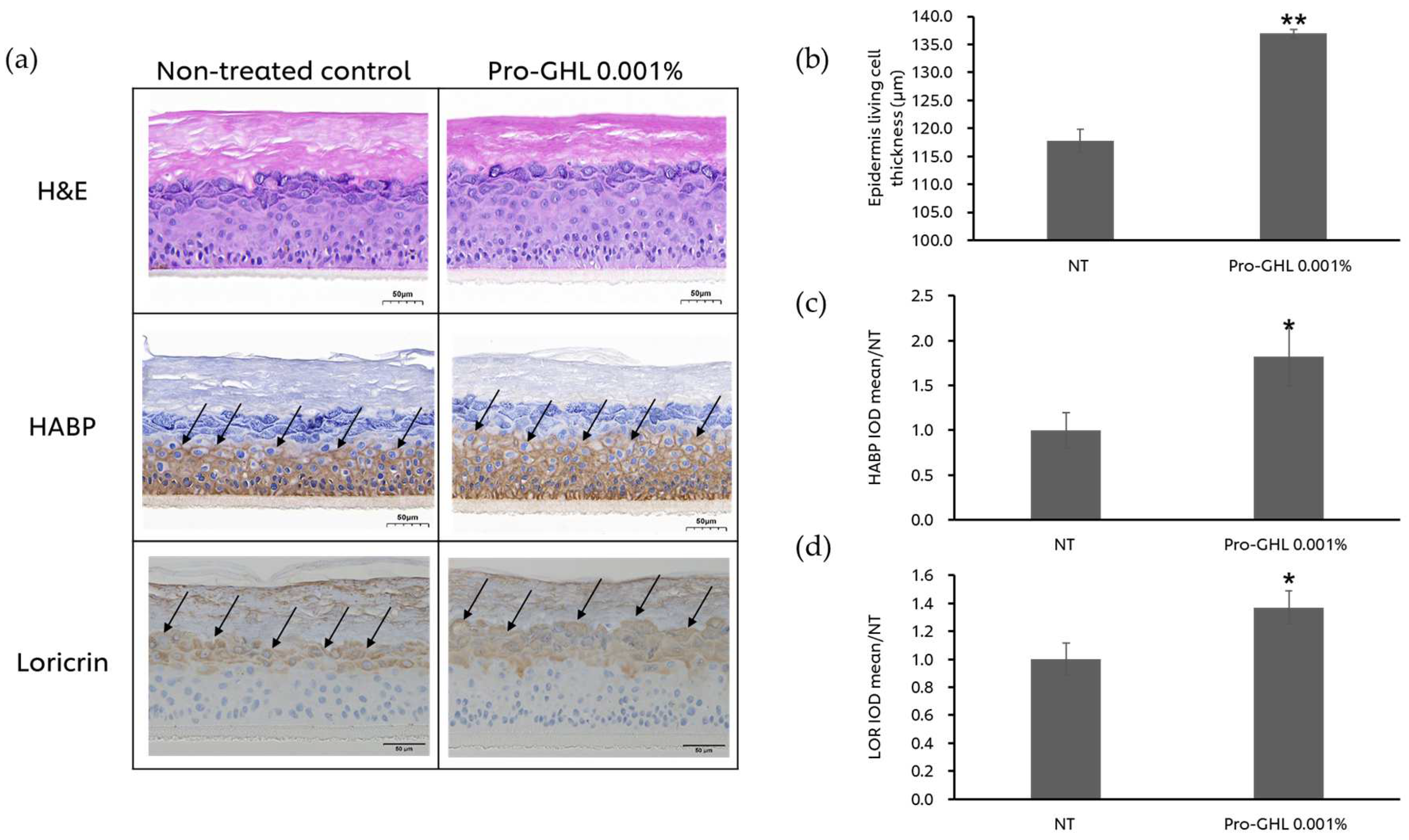 3.4. The Effects of Pro-GHL on the 3D Skin Equivalent Model