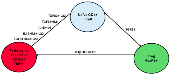The Th17/Treg axis plays a fundamental role in autoimmunity. Th17 and Treg cells both differentiate from CD4+ T cells and share a large portion of their transcriptome; however, they differ significantly in their functions. The Th17 cells represent a major lineage of CD4+ T-cells that contribute to the maintenance of the first line of defense against pathogens at barrier surfaces, while conversely also playing a critical role in the development of autoimmune diseases [40,41]. Naïve CD4+ T cells can differentiate into Th17 cells depending on the cytokine combinations present in their microenvironment. These combinations include TGFB3+IL23, TGFB1+IL6+IL23, TGFB3+IL6, TGFB1+IL6, IL21+TGFB1, IL1B+IL6+IL23, IL1B+IL6, and IL21+TGFB1, with differentiation occurring through a pathway mediated by the IL21 receptor (Figure 1) [42]. These cytokines, through activating TGFβ and SMAD, initiate the phosphorylation of Signal Transducer and Activator of Transcription 3 (STAT3), ultimately leading to the activation of RORγt, which is the main transcriptional regulator of Th17 cells, as well as other key transcription factors such as RORα, BATF, and IRF4 [43]. These transcription factors drive the production of three main cytokines, namely IL17A, IL17F, and IL22 [44,45,46]. These cytokines, in turn, have been implicated in the stimulation of the secretion of pro-inflammatory molecules, further participating in immunity against bacterial or fungal infections and in the pathogenesis of autoimmune or metabolic diseases such as multiple sclerosis, Alzheimer’s, rheumatoid arthritis, Parkinson’s, and IBD [47,48].