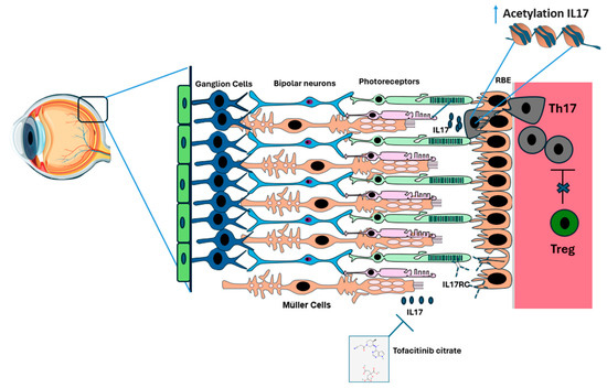 Infiltration of Th17 Cells into the blood–retina barrier (BRB) in diabetic retinopathy (DR). In a healthy eye, the retinal layers, comprising epithelial cells, ganglion cells, bipolar cells, rods, and cones, along with the retinal pigment epithelium (RPE), Bruch’s membrane, and choroid, remain intact. We hypothesize that as diabetes mellitus progresses, Tregs (in green) lose their ability to effectively suppress Th17 cells (in gray). As a result, Th17 cells infiltrate the RPE. This is followed by increased expression of IL17 through increased acetylation of IL17 in Th17 cells and possibly in Müller cells. When IL17 binds to its receptor IL-17RC on the surface of photoreceptors and endothelial cells, the Fas mechanism is activated, leading to photoreceptor and endothelial cell apoptosis. Tofacitinib citrate appears to inhibit IL17 function and reduce its associated inflammation.