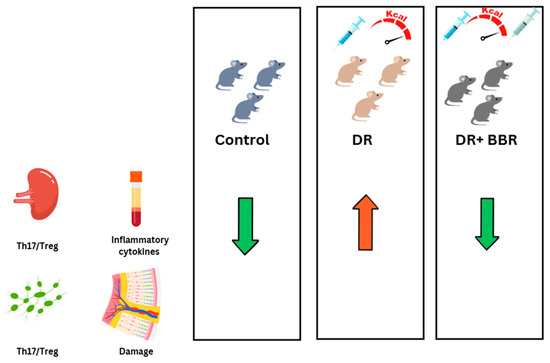 Interestingly, natural compounds like berberine appear to significantly mitigate the detrimental role of Th17 in DR. An interesting study by Yang et al. explored the potential therapeutic effects of berberine (BBR) on DR, specifically focusing on its impact on the Th17/Treg cell balance [92]. In this study, a streptozotocin (STZ)-induced diabetic mouse model was used, with BBR treatment administered over a period of 5 weeks. The results revealed that BBR alleviated retinal damage, reduced inflammatory cytokines (TNF-α, IL-1β, IL-6), and favorably altered immune cell populations. Specifically, BBR inhibited the Th17 cells while promoting Treg cell expansion in the spleen and lymph nodes, thus reducing the Th17/Treg ratio (Figure 3). In vitro studies further demonstrated that BBR directly down-regulated the Th17/Treg ratio by modulating key transcription factors RORγt and Foxp3 in T cells and indirectly by influencing dendritic cells to enhance anti-inflammatory cytokine production (TGF-β, IDO) and reduce pro-inflammatory cytokine secretion. These findings suggest that BBR exerts its therapeutic effects in DR by modulating the immune response through the regulation of the Th17/Treg axis, offering a promising treatment strategy for DR [92]. Additionally, curcumin, which is known for its histone acetyltransferase inhibitory properties, has been shown to effectively suppress the high glucose-enhanced histone acetylation of IL17A-targeted genes in DR [75].