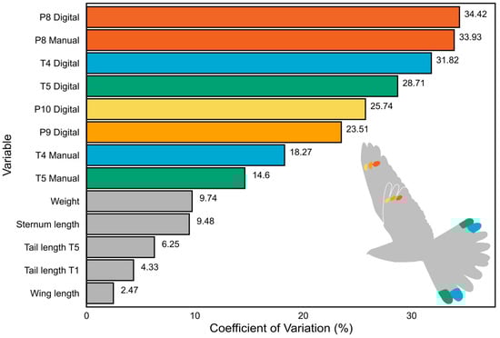 Comparison of the coefficient of variation (CV) values for marking sizes and other morphometric traits. The values at the end of each bar represent the CV of the corresponding variable. Note that all marking sizes exhibit higher CV values than other traits, indicating a greater likelihood that sexual selection pressure acts on the markings. The colour of the bars corresponds to the respective feather markings (T4—blue, T5—green, P8—dark orange, P9—light orange, P10—yellow); the non-ornamental body traits are grey-coloured.