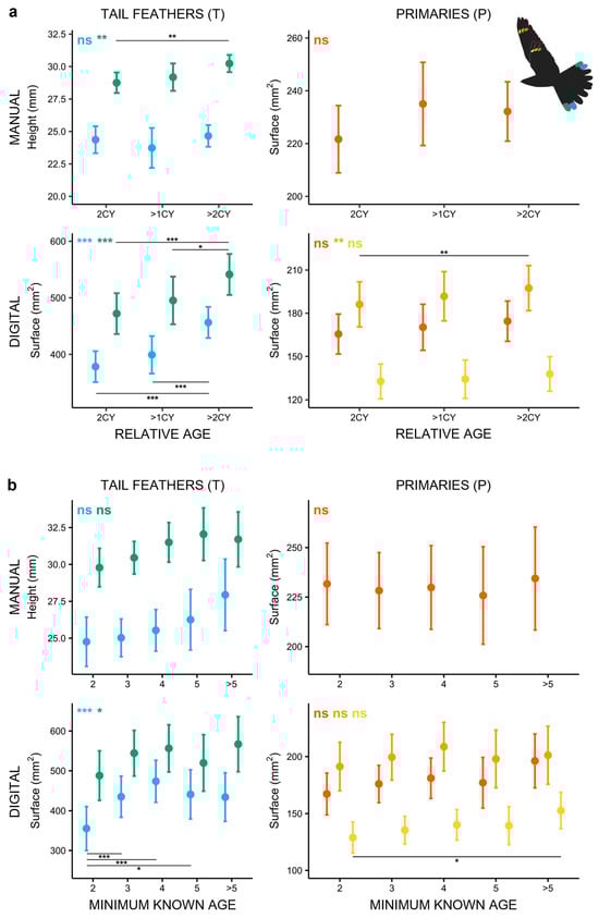 Marking size of male Nightjars in relation to: (a) relative age (full dataset) and (b) minimum known age (based on recapture data). Older males generally have larger markings, especially in the rectrices. Notable increases in the marking size with minimum known age are evident in the surface area of the tail markings. Pairwise tests reveal a significant increase in T4D ornament size between 2CY and older birds. Inscriptions in the upper left corner indicate the overall significance of the models with matching colours, horizontal lines with asterisks mark significant post hoc results. (“*” corresponds to p < 0.05; “**” corresponds to p < 0.01; “***” corresponds to p < 0.001); “ns” corresponds to a non-significant result (p > 0.05). The colours correspond to the respective feather markings in the flying Nightjar icon.