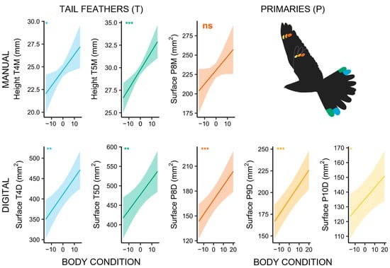 Marking size of male Nightjars in relation to their body condition index, showing a strong correlation between larger markings and higher body condition. Inscriptions in the upper left corner indicate the overall significance of the models with matching colours (“*” corresponds to p < 0.05; “**” corresponds to p < 0.01; “***” corresponds to p < 0.001); “ns” corresponds to a non-significant result (p > 0.05). The colours correspond to the respective feather markings in the flying Nightjar icon.