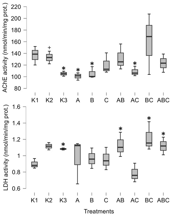 Minimum, maximum (whiskers), and median (bar) values of tadpoles’ acetylcholinesterase activity (AChE) and lactate dehydrogenase activity (LDH). The asterisk marks significant differences compared to K1, while the plus marks a significant difference compared to K3. K1—sterile FETAX solution, K2—lake water, K3—sterile lake water, A—Mesobacillus sp., B—Bacillus pumilus, C—unidentified bacteria.