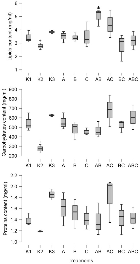 Minimum, maximum (whiskers), and median (bar) values of tadpoles’ lipids, carbohydrates (C-H), and protein content. The asterisk marks significant differences compared to K1, while the plus marks a significant difference compared to K3. K1—sterile FETAX solution, K2—lake water, K3—sterile lake water, A—Mesobacillus sp., B—Bacillus pumilus, C—unidentified bacteria.