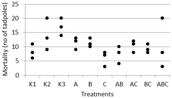 Finally, mortality rates observed during the experiment (Figure 4) did not differ significantly between the groups with FETAX (Bayesian ANOVA), suggesting that it was not related to experimental treatments, i.e., added bacteria. In lake water controls, mortality was highest, especially in the sterile lake water (K3) (Figure 4).