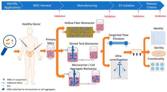 Considerations and steps for automated manufacturing of cGMP-grade EVs from conditioned media. After an application has been identified, a healthy donor is selected, and primary MSCs are harvested. MSCs are cultured in automatic bioreactors. Conditioned media are collected, and EVs are isolated from the conditioned media. The final step is confirming that the product meets all release criteria and is safe to be released for clinical application. Validation runs are performed after every step, as indicated in red. Figure created with Motifolio Toolkits (Motifolio Inc, Ellicott City, MD, USA).