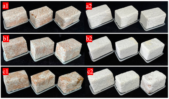 The second stage of preparing the mycelial composite materials was material post-treatment: after the mycelial system of each treatment group was fully constructed and the mycelium was covered with the substrate, the sample was demolded using the tin foil attached to the mold and placed in a slightly larger sealed container. It was further cultured in the same environment for 3 days to ensure that the mycelial surface in contact with the mold wall continued to grow and form a complete, dense, and white sample. Subsequently, the material sample was placed in a 60 °C oven (DHG-9140, Shanghai Yiheng Scientific Instrument Co., Ltd., Shanghai, China) and dried to a constant weight, and the sample state was adjusted at 25 °C for subsequent experiments.