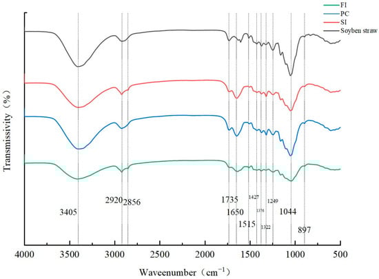 The peak at 3045 cm−1 represents the stretching vibration of -OH in the hydroxyl group. This -OH comes, on one hand, from H2O, and on the other hand, from the alcohols and phenols in cellulose and lignin [35,36]. Compared with the substrate without inoculated strains, the other three samples contain mycelia, which hold water, thus increasing the -OH content.