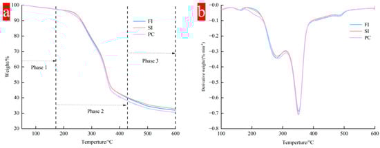 The second stage is 172 °C to 428 °C, which mainly corresponds to the degradation of macromolecular components in mycelial composites. It mainly includes the polymerization and decomposition of chitin, amino acids, lipids, and polysaccharides, as well as the acetylation and deacetylation units of chitin in mycelium [38]. These polymers are mainly degraded by decomposition into small molecules. When the temperature exceeds 250 °C, the mass of the materials prepared by the three mixing methods begins to reduce considerably because of the rapid degradation of carbohydrates such as cellulose and hemicellulose. At this time, a smaller peak appears at about 300 °C in the DTG curve, which is due to the degradation of hemicellulose; then, the peak value of the curve reaches its maximum value at 350 °C, corresponding to the degradation of cellulose, which has a higher degradation temperature.
