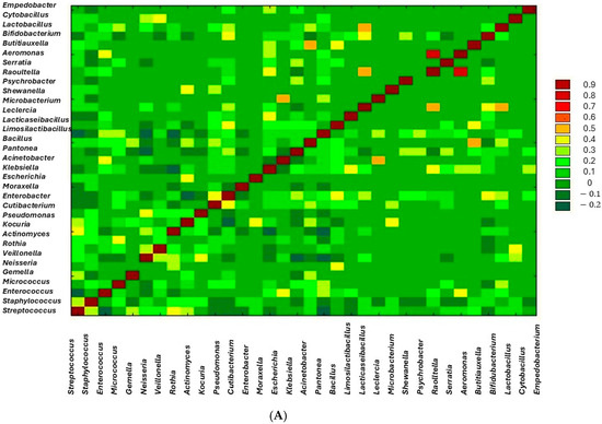 In human milk, an increase in Streptococcus spp. species was observed along with an increase in Rothia spp. (r = 0.306, p = 0.001) and Kocuria spp. (r = 0.254, p = 0.023). Positive correlations were observed between Enterococcus spp. and Escherichia spp. (r = 0.347, p = 0.001), Micrococcus spp. and Bifidobacterium spp. (r = 0.266, p = 0.020), Dermacoccus spp. and Limosilactobacillus spp. (r = 0.349, p = 0.001), Neisseria spp. and Actinomyces spp. (r = 0.391, p = 0.001), Micrococcus spp. and Corynebacterium spp. (r = 0.312, p = 0.005), Kocuria spp. and Moraxella spp. (r = 0.317, p = 0.001), and Pseudomonas spp. and Enterobacter spp. (r = 0.366, p = 0.001).
