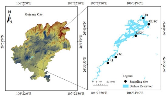 Baihua Reservoir (26°35′–26°41′ N, 106°27′–106°32′ E), located in the Karst region of southwest China, is part of the Maotiao River basin within the Wujiang River system, a tributary of the Yangtze River. BHR features a maximum water depth of 45 m and an average water depth of 10.8 m. BHR has a basin area of 1895 km2, a total capacity of 1.82 × 108 m3 and a total annual water supply of 28.72 × 106 m3, it serves as a crucial supply of drinking water for Guiyang City and is vital for electricity generation, flood management, and agricultural irrigation, as well as tourism. Its water quality is intricately linked to both the aquatic ecological environment and the living standards of the local inhabitants [].
