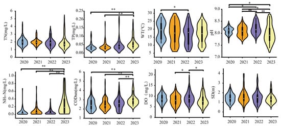 Changes in physicochemical indexes of BHR from 2020 to 2023. (TN, total nitrogen; TP, total phosphorus; NH3-N, ammonia nitrogen; CODMn, permanganate index; DO, dissolved oxygen; SD, transparency); (the wider the width in the figure, the more data points in the data range; * denotes significant difference p < 0.05, ** denotes highly significant difference p < 0.01).