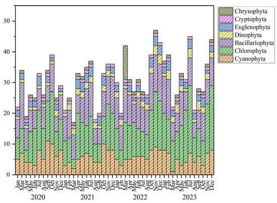 During the study period, the surface water of BHR was found to contain a total of 95 phytoplankton species belonging to 7 taxonomic categories. The Chlorophyta dominated the phytoplankton community with 43 species, constituting 45.26% of the total species count. This was followed by Bacillariophyta with 25 species, making up 26.32%, and Cyanophyta with 17 species, comprising 17.89%. Together, these three phyla accounted for 89.47% of the total phytoplankton species. There were fewer species in the phyla of Dinophyta, Euglenophyta, Cryptophyta, and Chrysophyta, which accounted for about 10.53%. The four-year study period, in descending order of the number of species, was 2023 (77 species), 2022 (67 species), 2020 (66 species), and 2021 (64 species) (Figure 3).