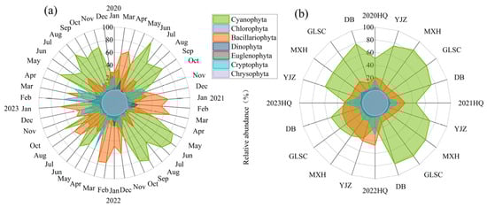 Temporal (a) and spatial (b) dynamics of phytoplankton relative abundance.