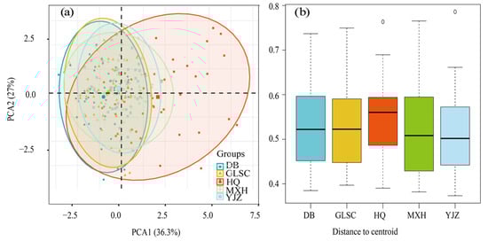 Principal component analysis (PCA) was used to visualize the phytoplankton abundance and physicochemical data of the five BHR sites, and it was found that there was overlap between different sites. The permutation multivariate dispersion analysis was used to determine whether there were significant statistical differences between different sample groups []. The proportion of variance explained by each principal component in PCA is calculated by dividing the eigenvalue of that principal component by the total sum of the eigenvalues of all principal components. The first principal component accounts for 32.00% of the variance, while the second principal component contributes 27.50% to the variance. Except for the HQ site, the other four sites have a large overlap area, and the community similarity is high. According to the displacement multivariate dispersion analysis, there is spatial heterogeneity among the points of BHR (Figure 5). Hence, this research will explore the succession features and the stability of functional groups within BHR, examining these aspects from both temporal and spatial perspectives.