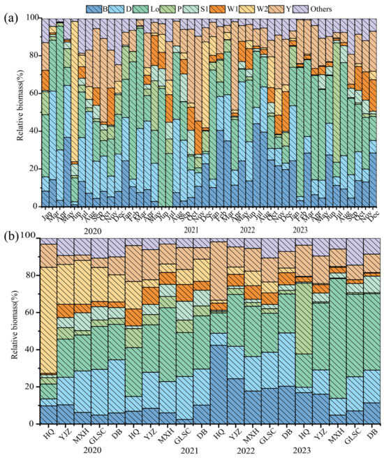 The relative biomass of the dominant phytoplankton functional groups in BHR exhibited temporal (a) and spatial (b) fluctuations.