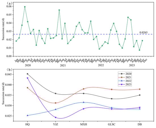Monthly average succession rate (a) and spatial average succession rate (b) of functional groups from 2020 to 2023 (the blue dashed line denotes the mean succession rate).