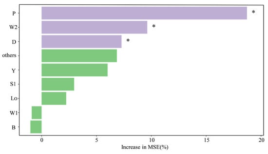 Random Forest is a powerful machine learning technology that is widely used in classification and regression problems. The Random Forest model is employed to rank the importance of variables. A higher score indicates a more substantial influence on the model’s predictive outcomes []. The key functional groups affecting the SR were identified through Random Forest. The results showed that the P, W2 and D functional groups were strong predictors of the SR of BHR, and the P functional group had the strongest predictability (Figure 8).