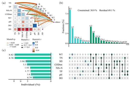 The Mantel test shows the relationship between environmental factors and functional groups (a); variance partitioning results were visualized through an upset matrix plot, with vertical bars representing combined explanatory power of environmental factors on phytoplankton functional groups (b) and horizontal bars depicting the individual contributions of environmental factors (c).