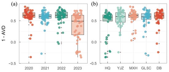 Temporal (a) and spatial (b) variations in the AVD of the phytoplankton functional group community in BHR.