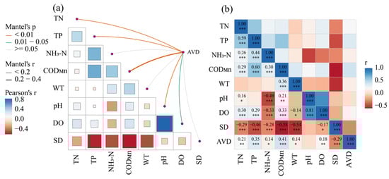 Mantel test (a) and heatmap (b) of AVD and environmental factors of BHR (*, **, *** in the figure represent the significance levels of p < 0.05, 0.01 and 0.001 respectively).