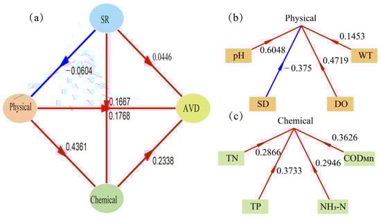 To ascertain the relationship between the SR, AVD, physical factors (WT, pH, DO, SD), and chemical factors (TN, TP, NH3-N, CODMn) of the functional group of BHR, PLS-PM was applied to the four factors, which did not require high data normality and independence, and has been widely used to study the complex multivariate relationship between variables []. The PLS-PM analyses identified interactions between all four of the SR, AVD, physical factors and chemical factors (Figure 12a).