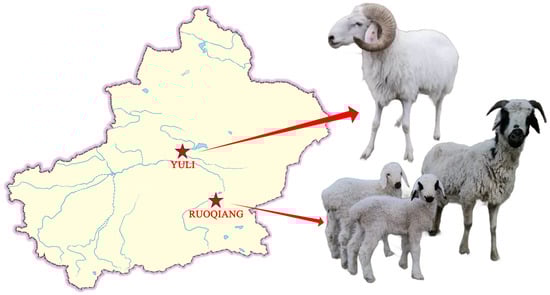 Lop sheep are distributed in the Lop Nur area of the Taklamakan Desert in Xinjiang. This unique local breed is exceptionally well suited for desert pastures, thriving in extremely arid climates, exhibiting resilience to rough feeding, and demonstrating a high tolerance for stress [1,2]. Currently, there are two populations of Lop sheep located in Ruoqiang County and Yuli County (Figure 1). Ruoqiang County, situated on the southeastern edge of the Taklimakan Desert, experiences perennial drought and a hot climate [3]. Local grazing primarily occurs on desert and semi-desert pastures, with forage types mainly including tamarisk, poplar leaves, reed grass, licorice, and camel thorns [4]. In this area, Lop sheep are predominantly grazed using traditional methods. In contrast, Yuli County features two major alluvial plains, where the climate is milder and more humid than that of Ruoqiang County. Pasture resources in Yuli County account for 14.71% of its total land area, with alfalfa and other green fodder being relatively abundant [5]. Here, Lop sheep are primarily fed in sheds alongside traditional grazing practices. Due to regional differences, the genetic characteristics and phenotypes of the Lop sheep populations in these two locations vary. Survey results indicate that the lambing rate of Lop sheep in Ruoqiang County is higher than that in Yuli County, and the meat quality and flavor are superior. Ruoqiang Lop sheep exhibit strong adaptability to the extreme natural environment of Lop Nur, characterized by drought, sandstorms, and high summer temperatures [6,7].