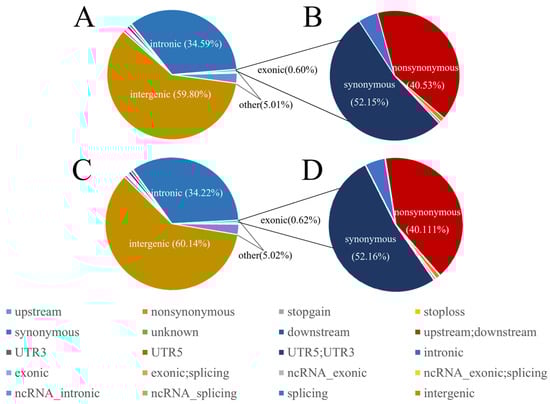 Statistics regarding the whole genome SNP variant types of RuoQiang and YuLi Lop sheep using ANNOVAR. (A,B) and (C,D) are Ruoqiang and Yuli Lop sheep. Plot of the total variant annotation and coding consequence variant annotation.