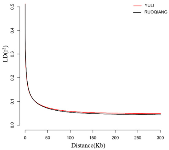 Through a comparative analysis of genetic diversity indicators, the observed heterozygosity (Ho) of the Lop sheep population was found to be 0.2938, while the expected heterozygosity (He) was 0.3011, the nucleotide diversity (π) was 3.36 × 10−3, and the inbreeding coefficient (Froh) was 0.0172. These results indicate that the genetic diversity of the Lop sheep population is relatively high. In comparison, the heterozygosity value of the Ruoqiang Lop sheep is slightly lower than that of the Yuli Lop sheep, and the inbreeding coefficient of the Ruoqiang Lop sheep is higher than that of the Yuli Lop sheep (Table 1). Additionally, the linkage disequilibrium (LD) results suggest that the degree of domestication of the Ruoqiang Lop sheep population is lower than that of the Yuli Lop sheep population (Figure 3).