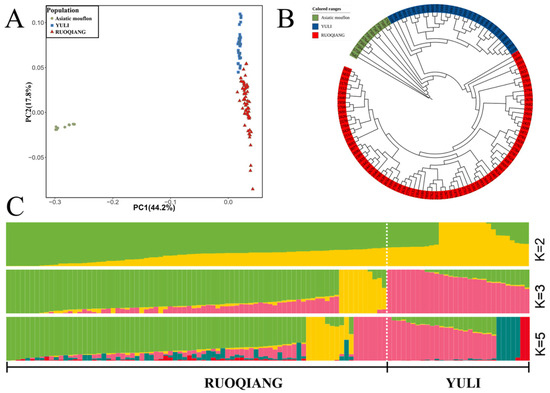 Illustrates a comparison of the population structure characteristics of Yuli and Ruoqiang Lop sheep. (A) Principal component analysis of Yuli and Ruoqiang Lop sheep, with the X-axis representing PC1 and the Y-axis representing PC2. (B) Neighbor-joining (NJ) tree depicting the relationships between the two groups of Lop sheep from Yuli and Ruoqiang. (C) ADMIXTURE results for Yuli and Ruoqiang Lop sheep are presented, showing population sizes k of 2, 3, and 5, with different colors indicating distinct ancestral components.