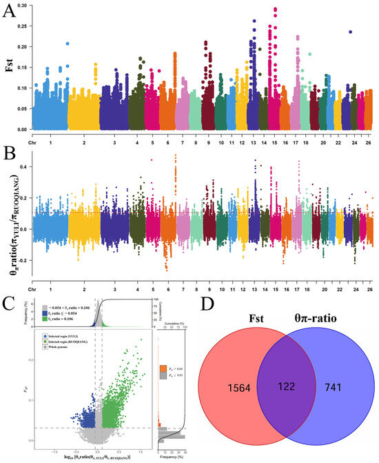 VCFTOOLS v0.1.16 software were used to compute FST and π ratio under autosomal conditions, employing a sliding window approach with a 100 kb window size and a 50 kb step size. Subsequently, a top 1% threshold was applied to identify significant selection signals and filter for intersecting genes [18].