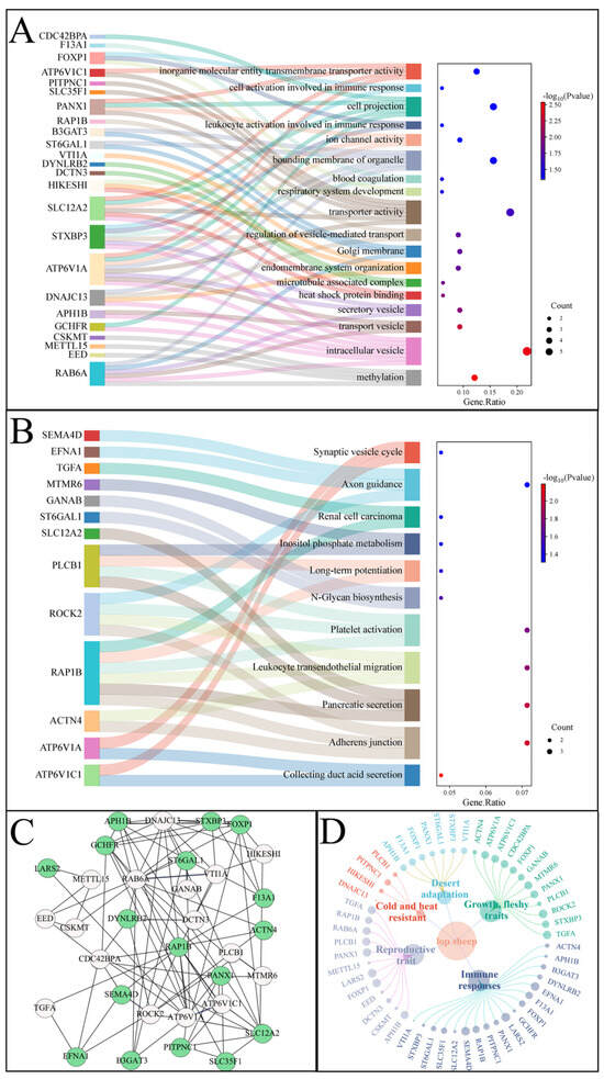 GO and KEGG pathway enrichment analysis shows significant (p < 0.05) terms, pathways, and associated genes in Ruoqiang vs. Yuli Lop sheep comparison. (A) The Sankey dot plot of the Top 18 GO terms. (B) The Sankey dot plot of the 11 significant KEGG pathways. The size of circles for each pathway represents counts of associated genes. The color of the circles indicates the p-value. (C) Gene networking analysis of 33 overlapping genes (p < 0.05). Green is identified as a candidate gene for the immune response in Lop sheep. (D) The network aggregation diagram illustrates 33 candidate genes that are annotated to five major traits (p < 0.05).