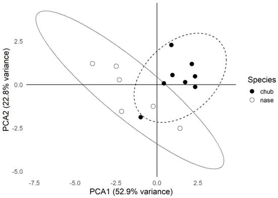 Principal Component Analysis (PCA) of trace element concentrations (mg kg−1, wet weight) in the scales of chub and nase from the Maros River. The circles around the points represent each species’ 95% confidence ellipses, indicating the variability and distribution of trace element concentrations within each group.