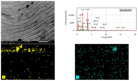 During the elemental mapping of the surface of the fish scales, we showed the presence of P, S, Cl, K, Ca, Mg, Fe, Ni, Zn, and Sr. Since fish scale samples are heterogeneous, the elemental composition may differ in specific areas of the scale depending on the position of the SEM images. The element maps are not absolute concentration maps, but only X-ray intensity maps in all cases. The method(s) used during our measurements were micro-XRF (Bruker M4 TORNADO) and Jeol SEM.