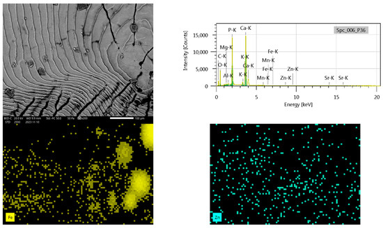 In the case of chub, the elemental composition analysis revealed distinct spectral patterns. The peak mass and atomic percentage of carbon indicate its dominance in the spectral line. Oxygen exhibits discrepancies between different spectral configurations. Potassium fluctuates in mass percent and atomic composition across spectral configurations. Calcium (Ca) and phosphorus (P) display variations in both mass% and atomic%, following similar patterns. The sulfur (S) content is inconsistent, while the mass% and atomic% of potassium (K) vary between spectral lines, highlighting the importance of considering spectral patterns. Manganese (Mn) is present in all configurations, whereas strontium (Sr) and zinc (Zn) show variable concentrations (Figure 2).