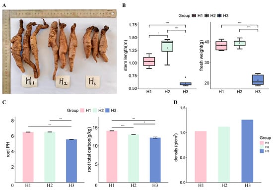 Morphological identification of C. napifera (Franch.) Babc. in different altitude conditions. (A) Phenotypic changes in C. napifera (Franch.) Babc. under different altitude conditions. (B) Stem length (cm) and fresh weight (g) under different altitude conditions. * indicated significance between two groups; *** indicated extremely significant between two groups. (C) pH value and total carbon content (g/cm3) of roots under different altitude conditions. * indicated significance between two groups; ** indicated very significant between two groups; *** indicated extremely significant between two groups. (D) Density of the roots at different altitudes. H1, roots of C. napifera (Franch.) Babc. collected from a low altitude (1858 m); H2, roots of C. napifera (Franch.) Babc. collected from a medium altitude (2417 m); H3, roots of C. napifera (Franch.) Babc. collected from a high altitude (2893 m).